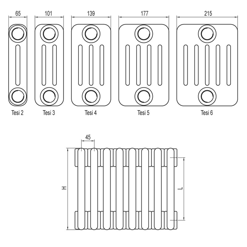 Размеры трубчатых радиаторов Irsap Tesi: