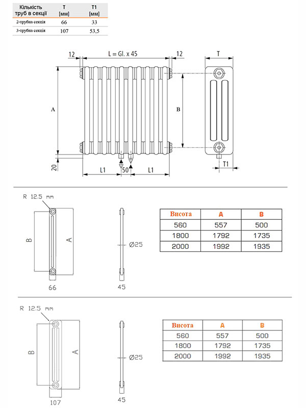 • 2 вариантов глубины: 66 и 107 мм (2–3 трубчатые радиаторы)