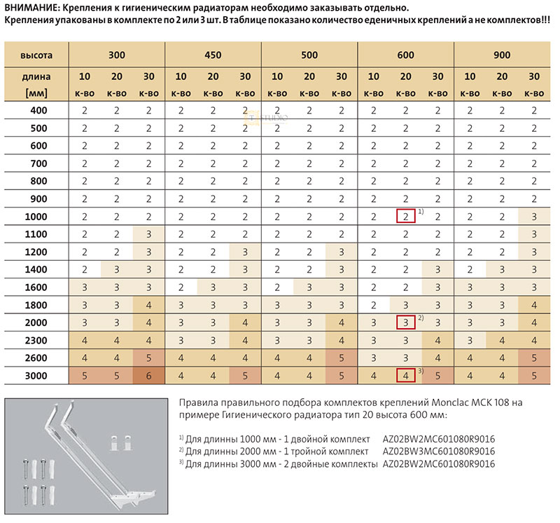 Количество настенных креплений для радиаторов Purmo высотой 300-900 мм, рассчитывается в зависимости от длины радиатора:
