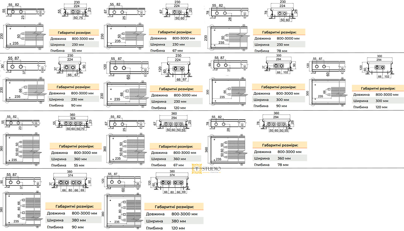 Внутрипольные конвекторы Ю-Кон с естественной конвекцией исполняются со следующими размерами: