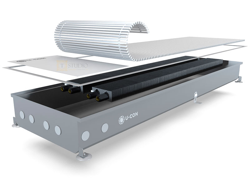 U-CON (Ю-КОН) EK2 внутрипольный конвектор без вентилятора с естественной конвекцией - это встроенный в пол отопительный прибор, предназначенный для создания тепловой завесы при панорамном остеклении. Имеет два теплообменника.