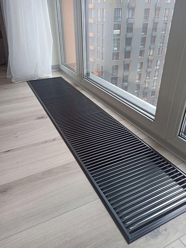 Декоративные решетки могут дополняться декоративной рамкой, которая скрывает короб конвектора и стык с напольным покрытием.