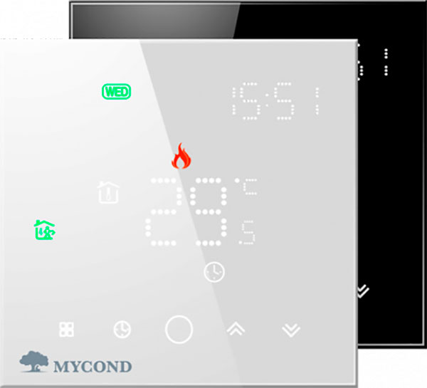 Термостат Mycond Block виготовляється британським брендом Mycond. Має унікальний суцільний глянцевий світодіодний дисплей. Такий дизайн дозволяє гармонійно вписати його як в класичний так і сучасний дизайн. Підходить як для житлових приміщень, так і для офісних.