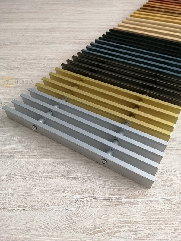 Алюмінієвим ґратам методом анодування надаються різні відтінки: сатин, бронза, золото, графіт. При необхідності виробник може здійснити фарбування алюмінієвих ґрат у будь-який колір RAL. Також можливе виконання алюмінієвих решіток з обробкою під структуру каменю та дерева, за наданим зразком.