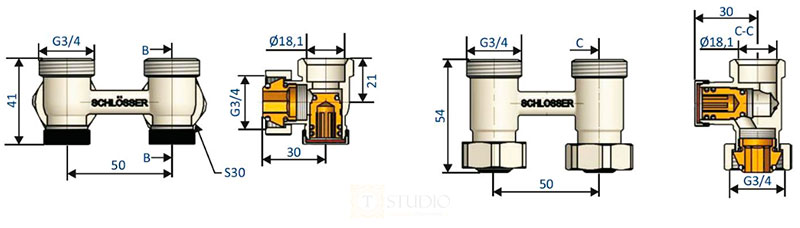 Радіаторний комплект нижнього підключення Standard Mini (Шлесер Стандарт Міні) представлений у кутовому та прямому виконанні. Розмір з'єднання зовнішня 3/4 – внутрішня 3/4.