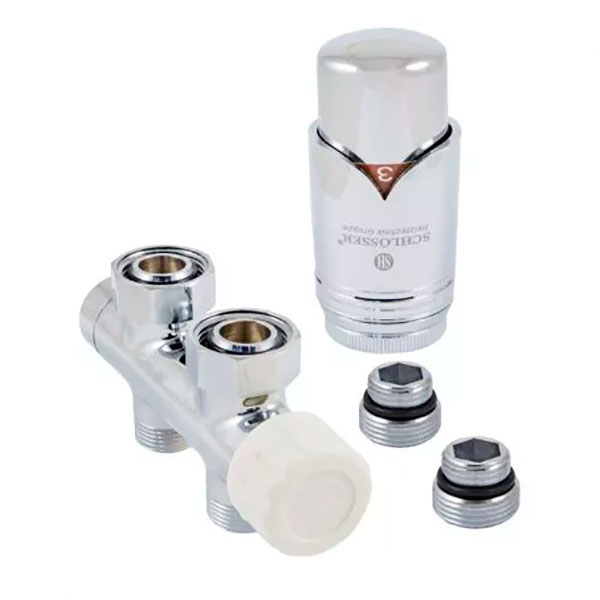 Schlosser Duo-Plex комплект нижнього підключення прямий хромований (602100033) - це комплект для нижнього підключення радіатора опалення з міжосьовою відстанню 50мм. До складу входить вузол термостатичний, термоголовка, ніпелі 1/2х3/4.