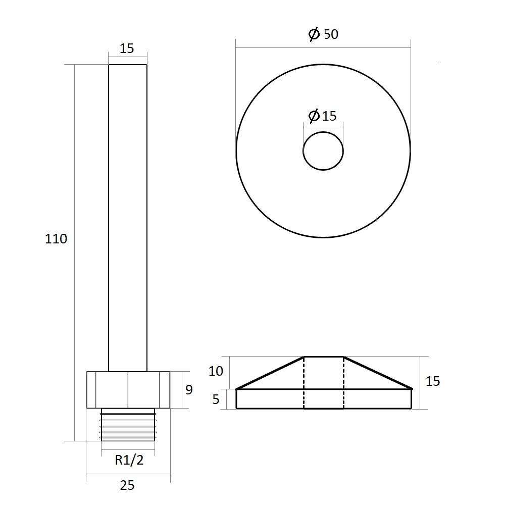 Розміри: 15х1 - 1/2, довжина 110 мм, розетка 50 мм.