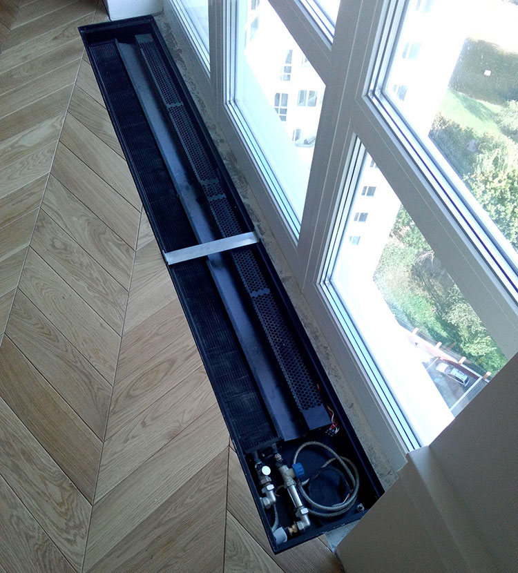 Громозкі сталеві радіатори обігрівають приміщення, але позбавляють задоволення насолоджуватися прекрасними видами відкриваються через фасадні вікона. Як правило, клієнти вважають за краще замінити їх радіаторами вбудованими в підлогу або зовсім не високими до 200-300 мм.